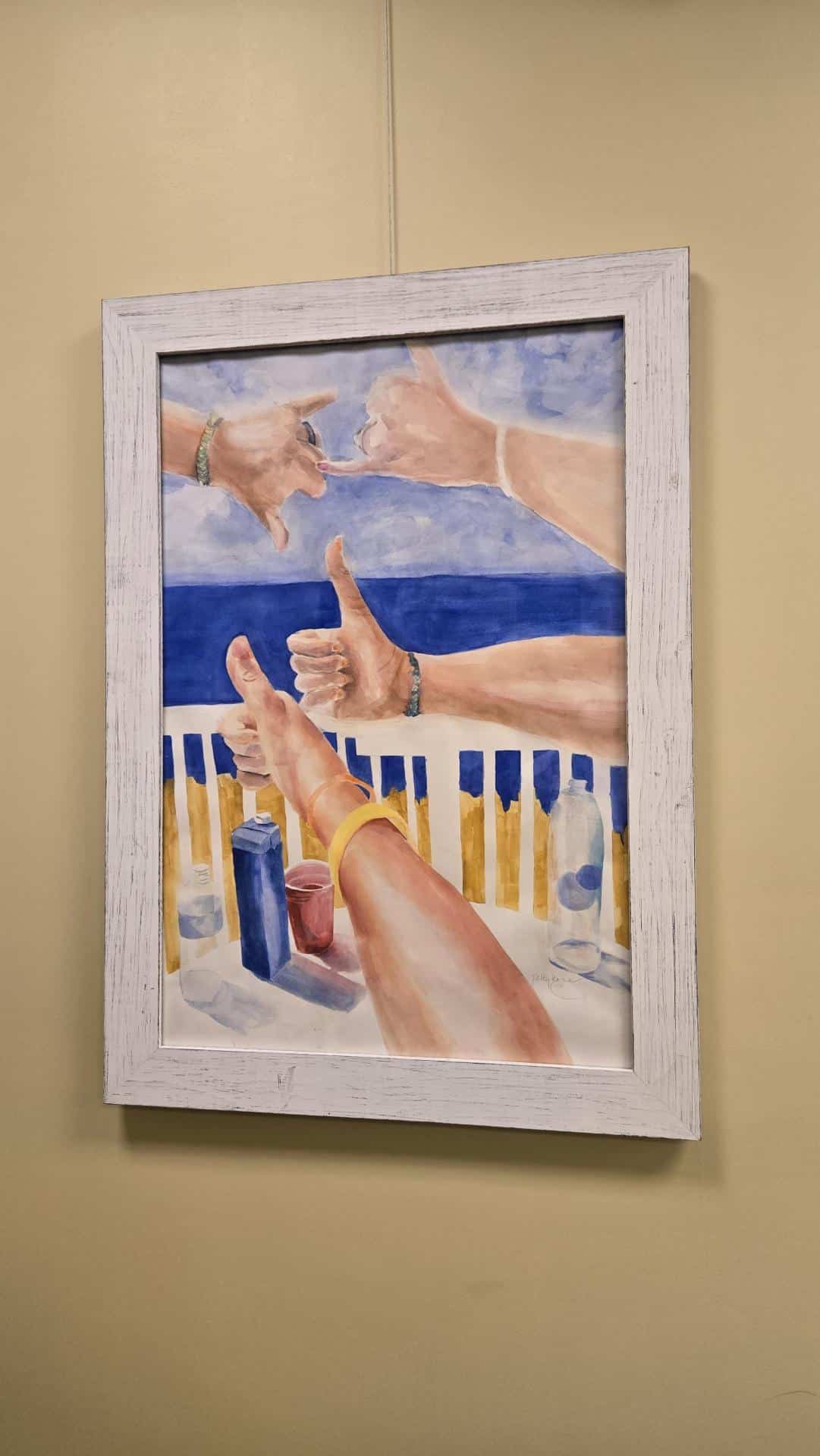 “Nature and painting outdoors (plein air) are the two biggest influences on Patty’s Sea Pour paintings. There is a presence at the shoreline where the ocean and the beach meet. To me, that is heaven. Process, Patty throw’s her watercolor paper in the ocean, let it float around and soak in the salty water until it is saturated. There is sand, shells, seaweed on the paper that plays a unique part in the making of the painting. Once the paper is taken out of the ocean and placed on the dry sand, she pours her watercolor paint on the paper and step back to watch the beauty of my collaboration with Mother Nature.”